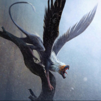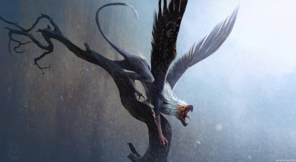 a mythical creature with the body of a lion and the head and wings of an eagle. The griffon appears to be standing atop a branch or perching on