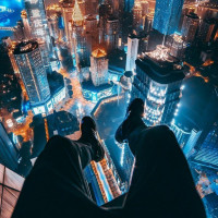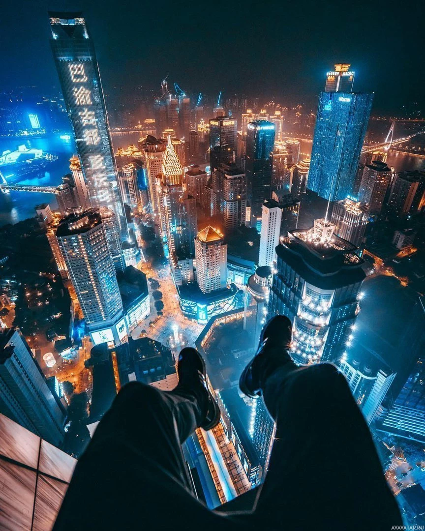 The picture shows a person sitting on the edge of a high
