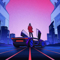 fiction aesthetic. In the foreground, there's a person standing on what appears to be a pedestrian overpass or walkway. The individual is looking towards a vehicle with its hood open, suggesting maintenance or inspection activity. The lighting and color palette give the scene a dramatic and atmospheric quality, reminiscent of retro-futuristic cityscapes often found in science