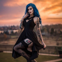 various tattoos on their arms and legs. The clothing style suggests a gothic or