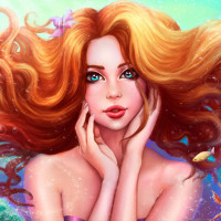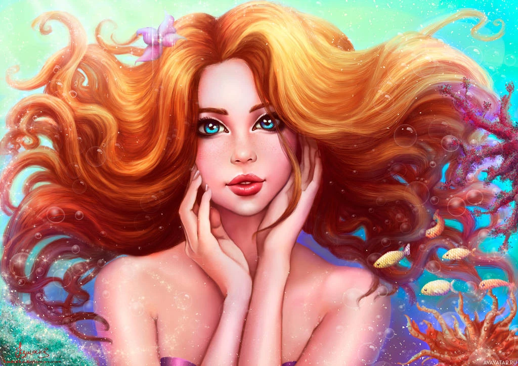 red hair. She has long, flowing locks and is looking away from the viewer. The background features underwater elements such as fish and coral, suggesting