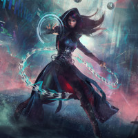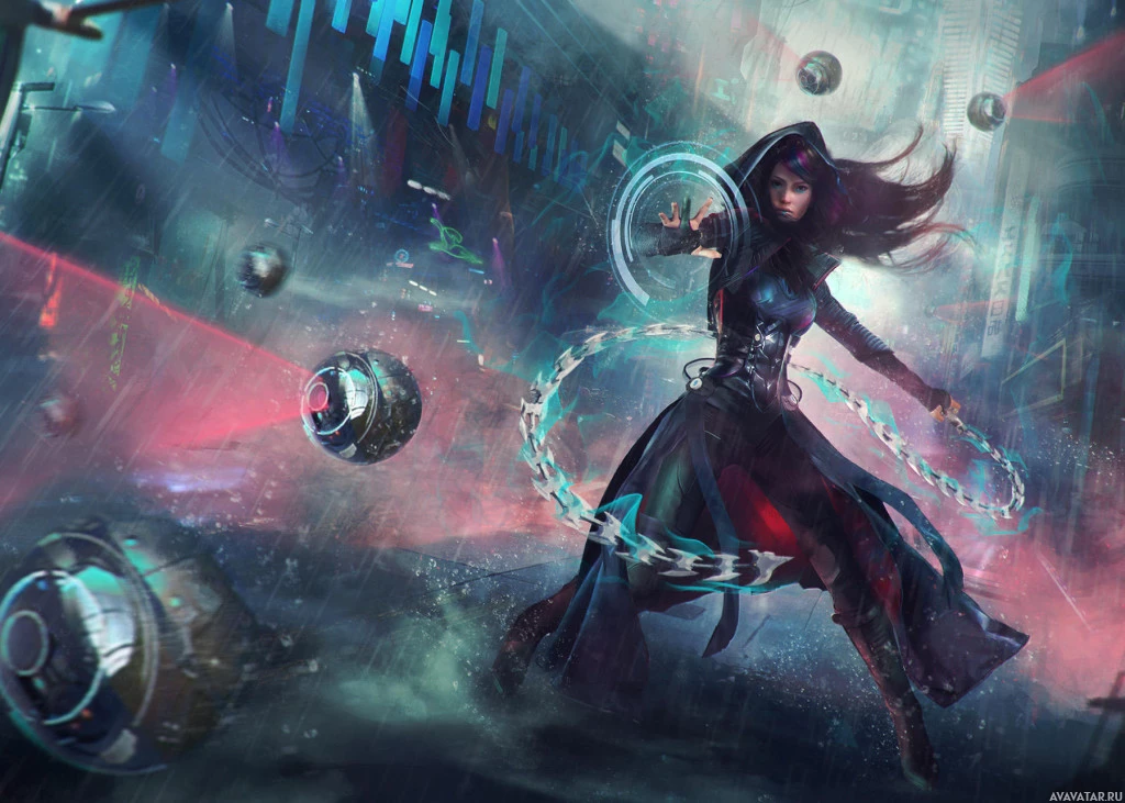 mechanical components, and a floating orb. The background is dark and moody, with a hint of rain or mist visible. The character's pose suggests movement or action, and she seems to be controlling or manipulating the energy that surrounds her.
