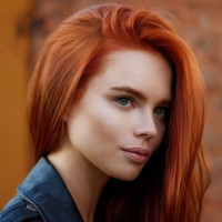 На картинке изображена женщина с рыжими волосами. Она носит черную куртку и имеет нейтральное выражение лица. Фон не является описательным, что позволяет сосредоточиться на теме фотографии.