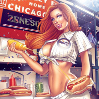 a hot dog and is also shown with other hot dogs and condiments around her. Her attire includes a baseball uniform shirt, shorts, and an apron that suggests she might be representing