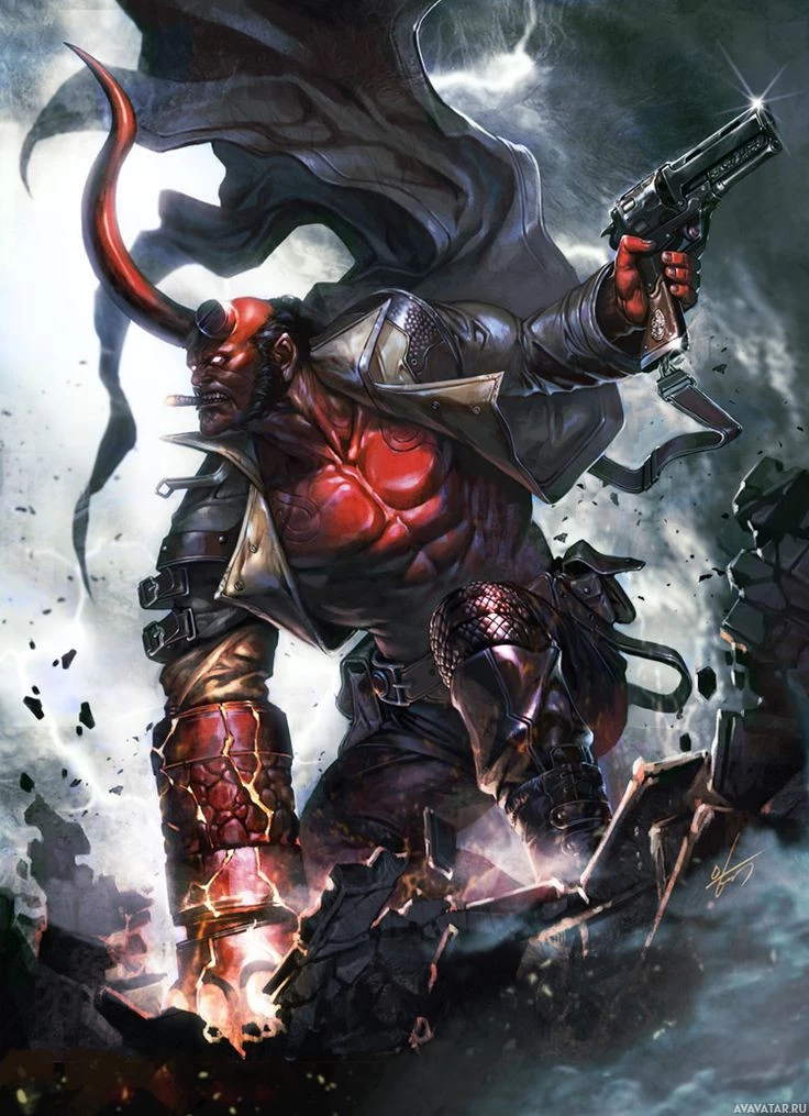 На картинке изображен персонаж из серии комиксов Hellboy. Этот персонаж известен своей демонической внешностью и ролью исследователя паранормальных явлений и супергероя. Он изображен с пистолетом, что говорит о том, что он может быть в середине последовательности действий или битвы.