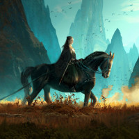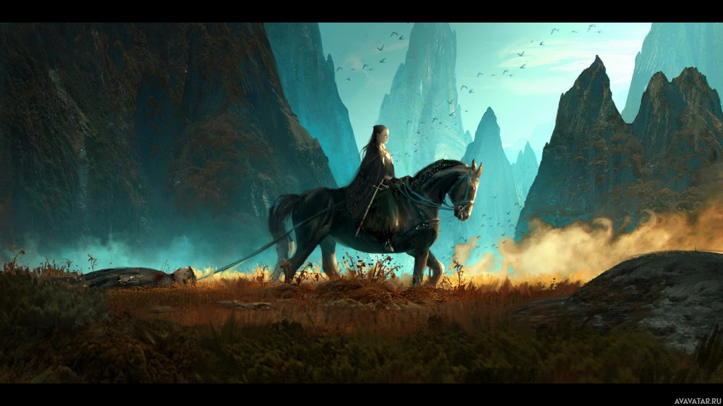 the back of a horse. The rider appears to be a woman dressed in medieval or fantasy-style attire, indicating that this might be a scene from a game or a work of