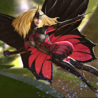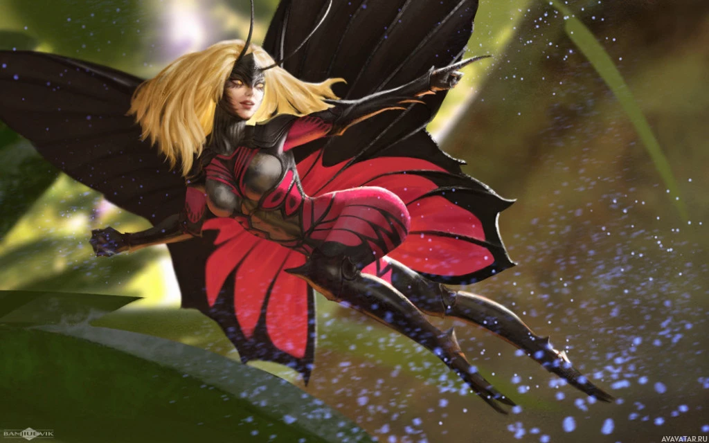 mythical creature. The figure has wings and is adorned in what appears to be a protective armor, suggesting she might have some