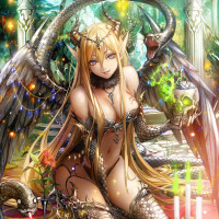 blonde hair, pointed ears, and is dressed in fantasy attire that includes armor, wings, and what appears to be demonic or supernatural elements, such as horns and a skull. The setting is whimsical and festive, with lights like candles or lanterns illuminating the scene. There's also a hint of