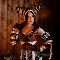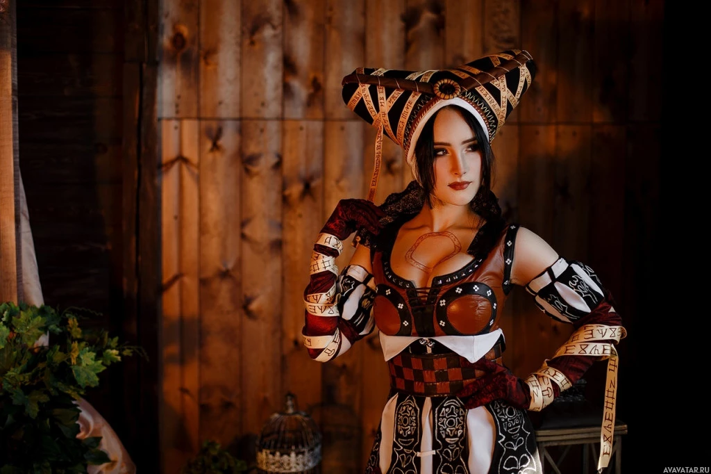 The image shows a person dressed in cosplay, imitating the style of a character from "The Witcher" game. They are wearing elaborate costume elements that suggest a fantasy setting and could be part of a fan event or a celebration of the game's universe.