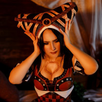 Triss Merigold from the game. They are wearing a headdress and have accessories such as earrings, which resemble those worn by Triss in the game. The setting looks like it could be a bedroom or a room with a stylized decor that is fitting for a fantasy-themed event or