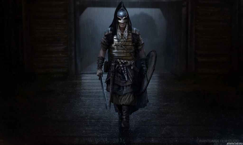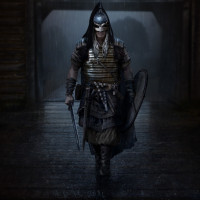 a video game or fantasy setting, judging by the stylized outfit and armor. The background suggests a rainy or damp environment, possibly indicating that this is during a battle or aftermath of one. The image has been altered with a filter effect to give it a dramatic, somewhat