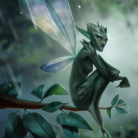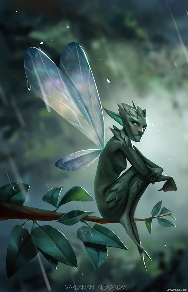 rain droplets falling from the sky, suggesting an atmosphere of dampness or possibly melancholy. The fairy's skin has a moss-like texture, blending into