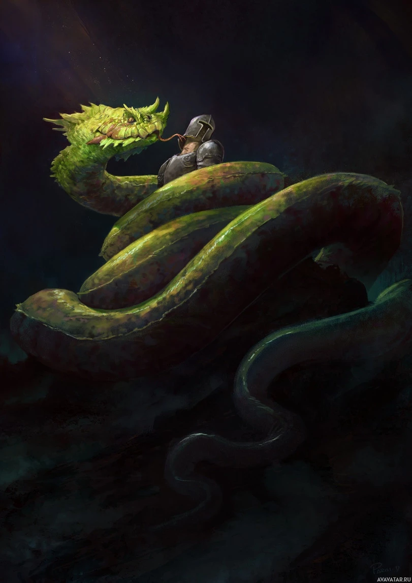 a fantasy scene where a warrior is sitting on the coiled body of a large snake. This scene likely represents an element from mythology, folklore or