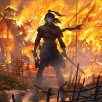 a fantasy character, as indicated by the presence of a sword and the overall style. They are surrounded by fire, suggesting destruction or conflict. The setting is not clearly identifiable, but it has the appearance of a village in flames, indicating that this might be a scene from a battle,