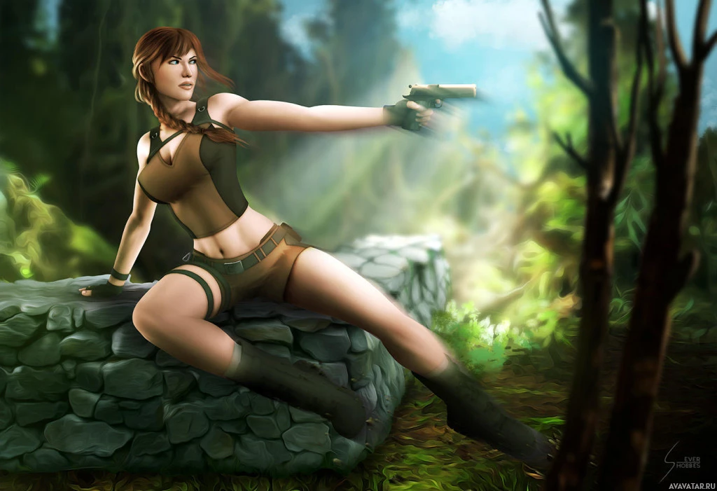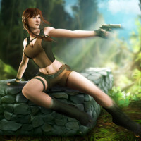 a handheld device with a screen displaying some graphics and data. She is dressed in attire resembling the outfit of Lara Croft from the Tomb Raider video
