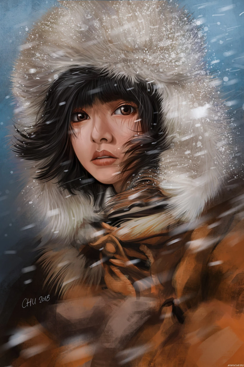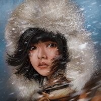 falling snow. She appears to be looking directly at the viewer, giving the impression of a portrait-style painting. The setting and her attire suggest a cold,