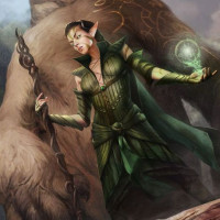 a fantasy scene where an elf woman is standing in front of a large bear. The