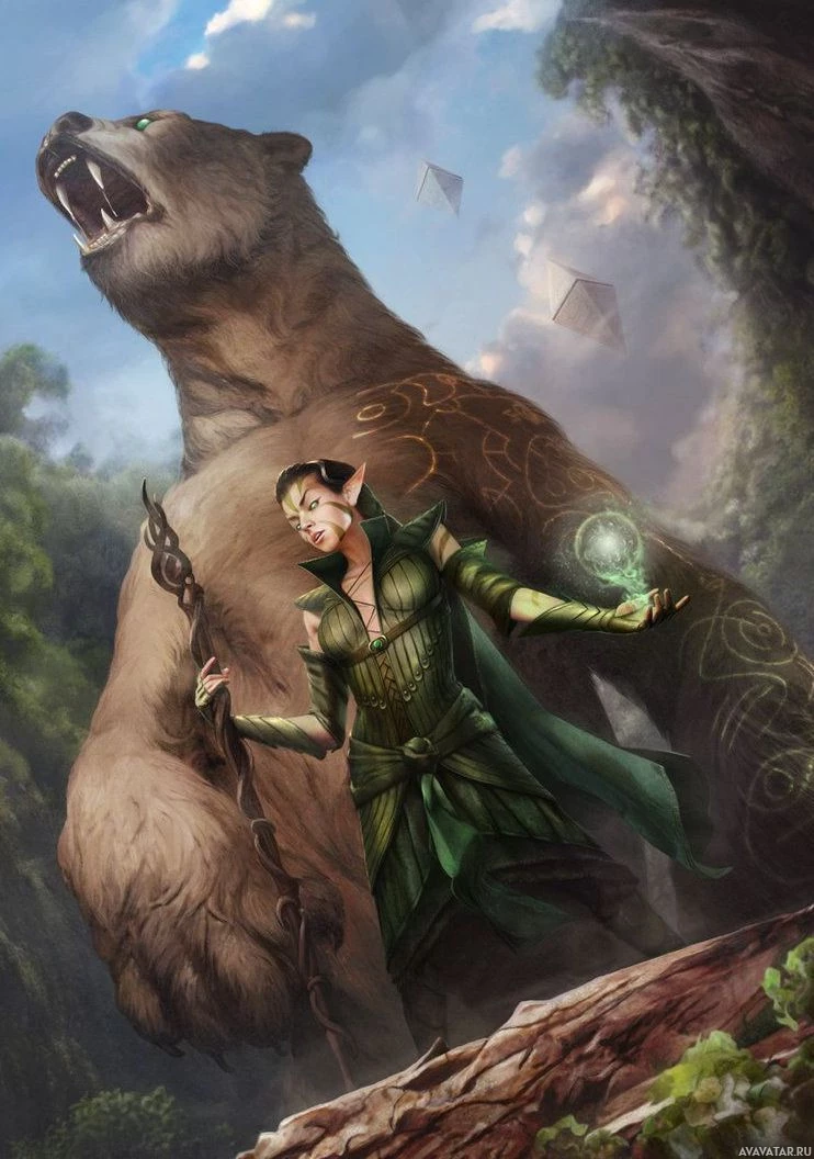 elf woman appears to be casting a spell or perhaps about to engage in combat with the bear, which has its mouth open as if it's roaring. The setting seems to be a wild,
