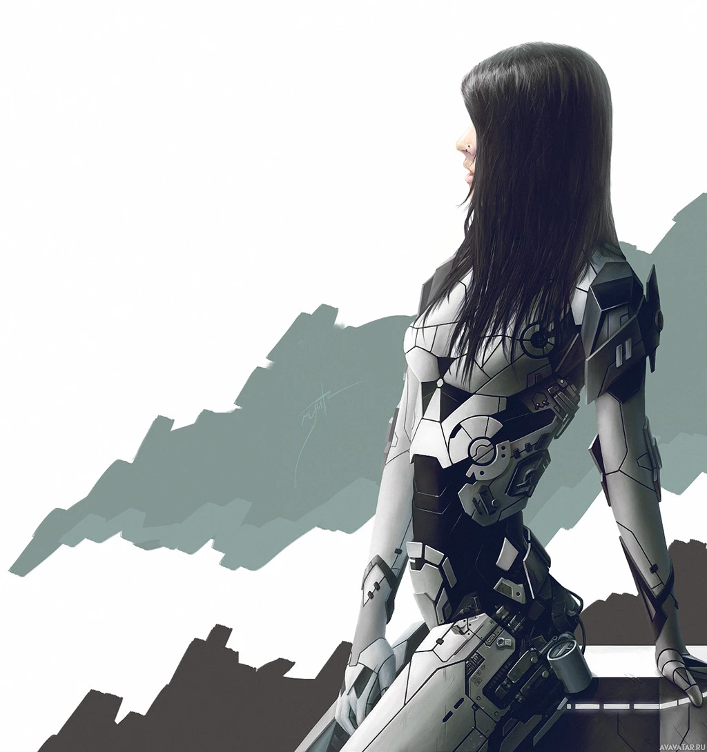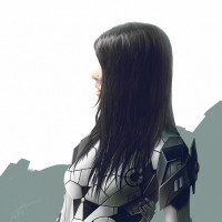 a female character with dark hair wearing a futuristic, metallic armor. She appears to be sitting or kneeling on a rocky surface with a backdrop that suggests an outdoor, rugged environment, possibly hinting at a setting in