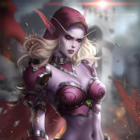 an animated character who appears to be a female drow, which is a type of dark elf in the fantasy genre. She is depicted wearing armor with purple and red accents, which are