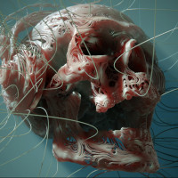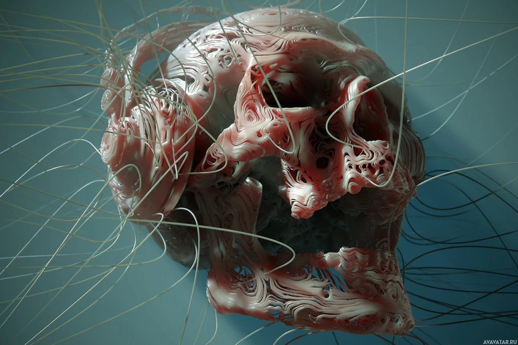 На картинке изображен череп с различными узорами и то, что кажется нитями или нитями материала, переплетающимися через его структуру. Это может быть художественное представление, возможно, символизирующее сложность и хрупкость человеческой жизни, или оно может представлять концепцию, связанную с связью и тонким балансом природы.