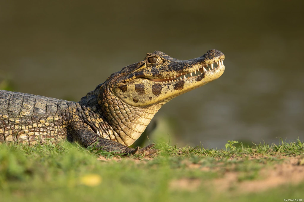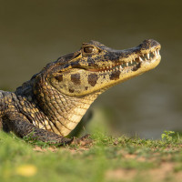 The image depicts a crocodile with its mouth open and eyes looking forward, possibly in