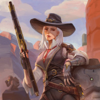 signature outfit which includes a hat and an overall theme that suggests she might be a cowgirl or a gunslinger type of hero. The setting appears to be