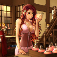 workshop setting, surrounded by various items that could suggest it's a place where crafting or alchemy takes place. There are bottles and vials on the table in front of her, possibly containing potions or ingredients. Other characters can also be seen around her, contributing to