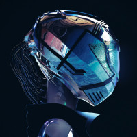 The image shows a figure with a helmet, which appears to be designed in a futuristic or science fiction style. The helmet has intricate details and possibly electronic components, suggesting