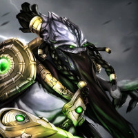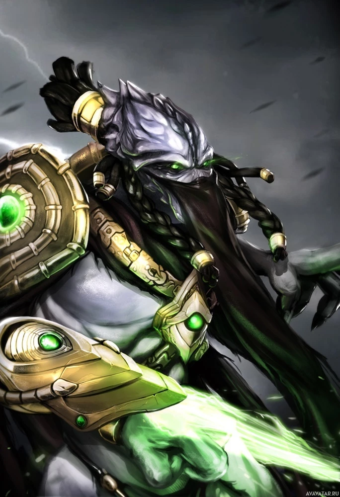 the StarCraft universe. She is depicted with various elements that emphasize her specialized abilities within the game. Her attire includes armor pieces and glowing green energy effects, which are typical of characters who have access to