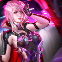 pink hair and is wearing a futuristic or fantasy-style outfit that includes a black and red bodysuit with armor-like details, such as shoulder pads and possibly a utility belt. The character's expression is somewhat contemplative or focused, and she appears to be in a pose that might suggest she is ready for combat or action. The background has neon-lit elements that add to the futuristic or