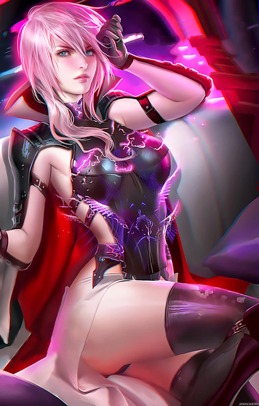 Картинка показывает цифровую иллюстрацию анимированного персонажа. Она имеет розовые волосы и носит футуристический или фэнтезийный наряд, который включает в себя черный и красный костюм с бронированными деталями, такими как плечевые подушечки и, возможно, пояс полезности. Выражение персонажа несколько созерцательное или сосредоточенное, и она, кажется, находится в позе, которая может указывать на то, что она готова к бою или действию. Фон имеет неоновые элементы, которые добавляют к футуристической или фантастической эстетике произведения искусства.