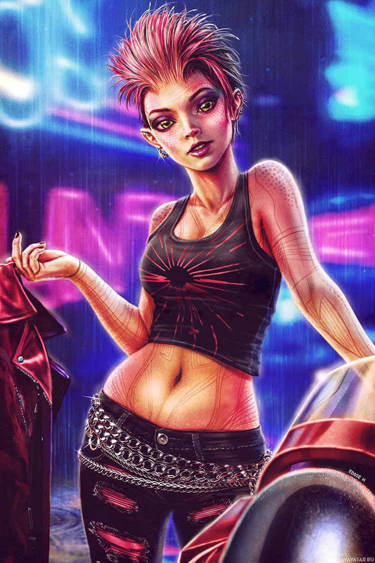 pink hair, and her appearance is quite distinctive with various tattoos or markings on her skin and arms, as well as a noticeable punk-rock style with a spiked haircut, piercings, and what seems to be an edgy fashion sense. She's wearing a red