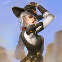 The image shows a character designed in the style of Overwatch, a popular multiplayer online game developed by Blizzard Entertainment. This particular character is named Ashe and is known for her cowboy-inspired outfit and abilities within the game.