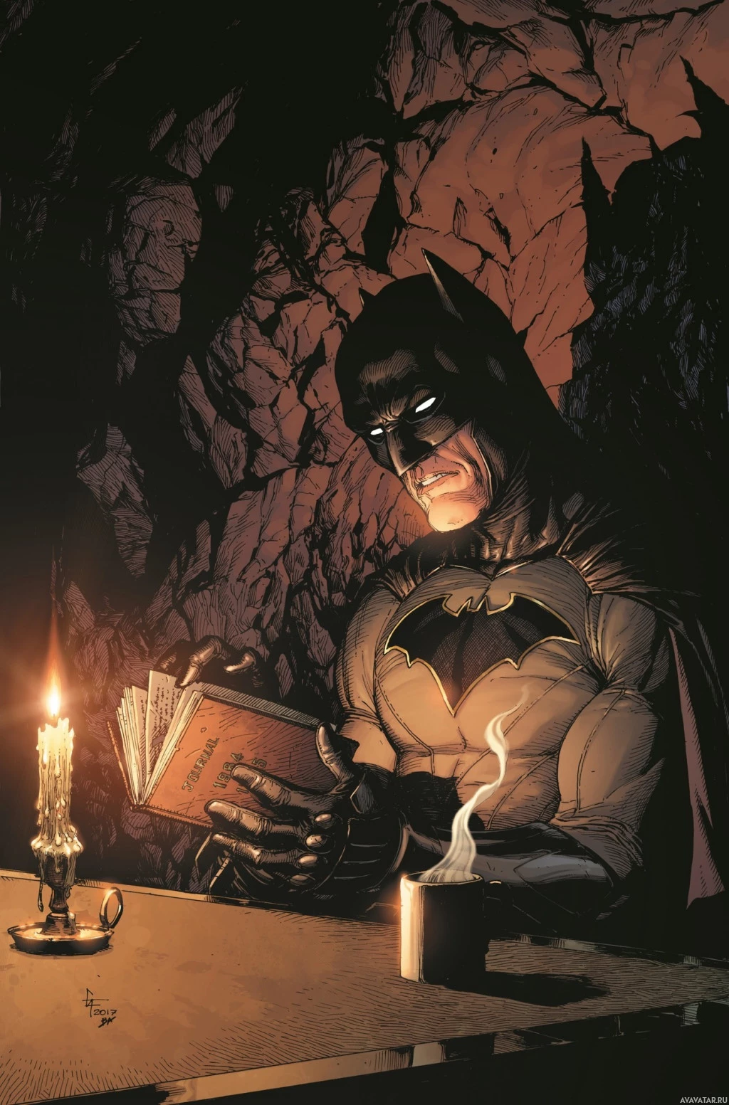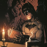 superhero character, sitting at a table with a lit candle in front of him. He is reading what appears to be an old book or manuscript, possibly related to his investigations or his past as