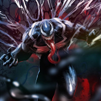 The image features a depiction of Venom, a fictional character from the Spider-Man comic books. This particular artwork is stylized and appears to showcase a dynamic pose with energy or particles around him, which could be associated with his powers or abilities.