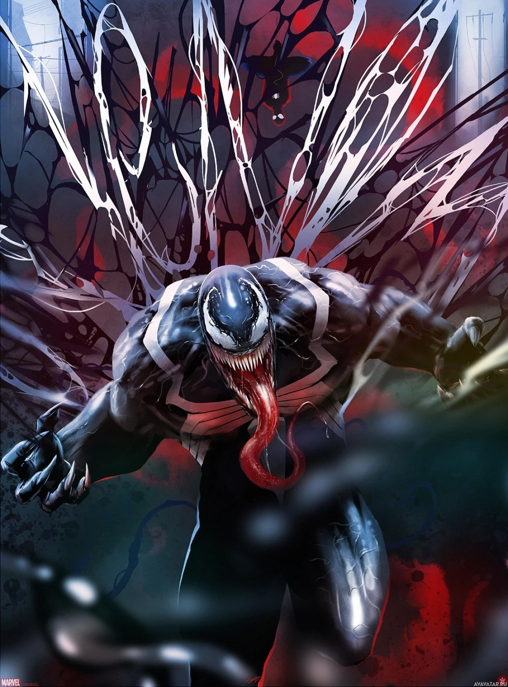 На картинке изображен Веном, вымышленный персонаж из комиксов о Человеке-пауке. Это конкретное произведение стилизовано и демонстрирует динамическую позу с энергией или частицами вокруг него, которые могут быть связаны с его способностями.