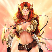 a female character with red hair. She is depicted wearing armor, including a breastplate and greaves, as well as a helmet with eye guards or lenses. She's also carrying what appears to be a weapon, possibly a spear or a trident. There are golden elements on her armor that give it