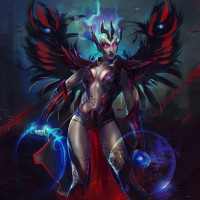 magical abilities to attack and harass enemies. The character is depicted with demonic features such as wings and horns, giving her an intimidating appearance. Her attire consists of a dark outfit with