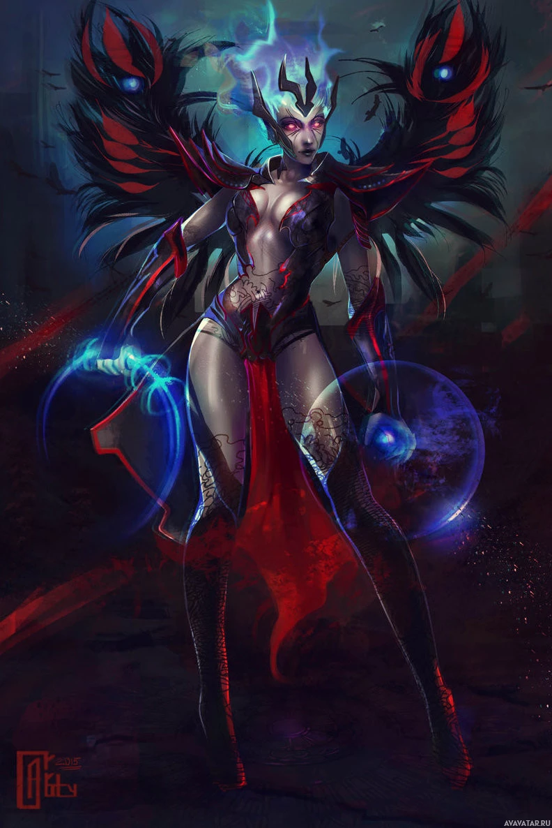 The image shows a character from the game Dota 2. She is known as the Vengeful Spirit, which is a hero in the game that specializes in using