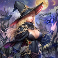 a pointed hat and holding what appears to be a wand or staff. She is set against a nighttime background with trees that have twisted shapes resembling bones, adding a dark and