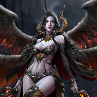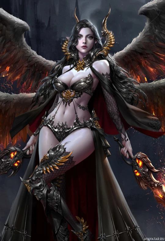 dark hair and pointed ears, suggesting she might be a demon or a creature with some sort of supernatural abilities. Her attire is ornate and features elements that could be interpreted as armor, with