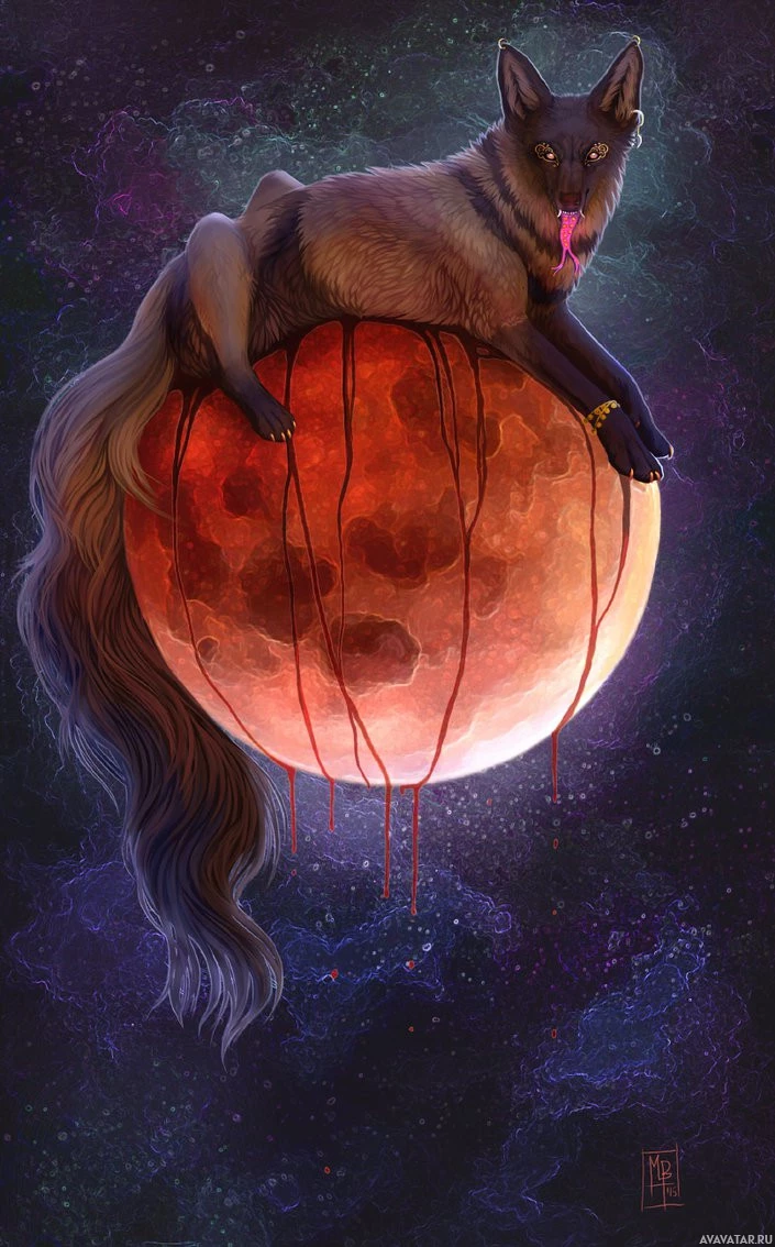 a celestial body that resembles the Moon. The Moon is depicted with a blood-red surface, which might suggest a lunar eclipse or