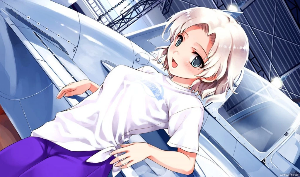 an aircraft hangar or workshop, which may imply that the character has an interest in aviation or technology.
