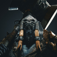 sort of weapon, possibly a sword or spear. The character has a helmet on and is looking directly at the viewer. The overall appearance suggests that this could be a fantasy-themed image, possibly from