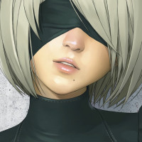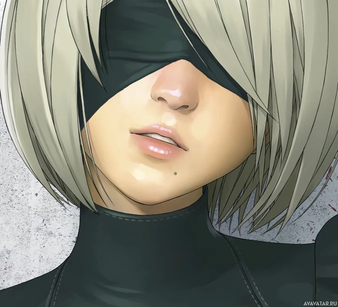 Это иллюстрация персонажа из видеоигры «Nier: Automata». Изображенный персонаж известен как Йоко, которая изображена с закрытыми глазами и с повязкой на глазах. У нее уверенное выражение лица.