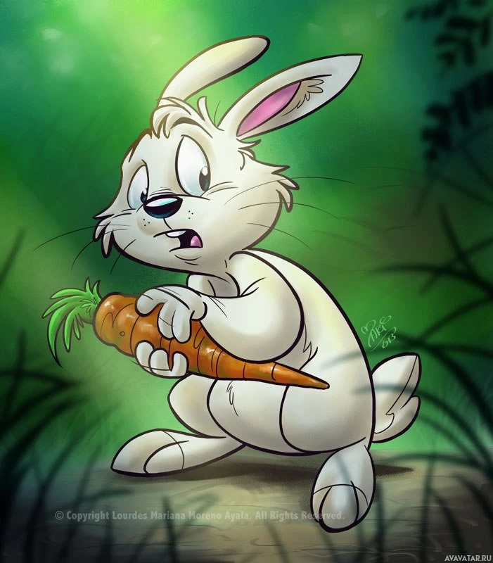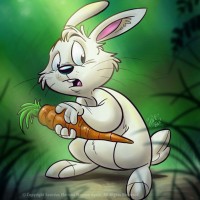 a forested area. He is holding a carrot, and it appears as though he's taking a break or perhaps contemplating something while eating the carrot. The background suggests a misty or damp environment, giving the scene