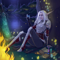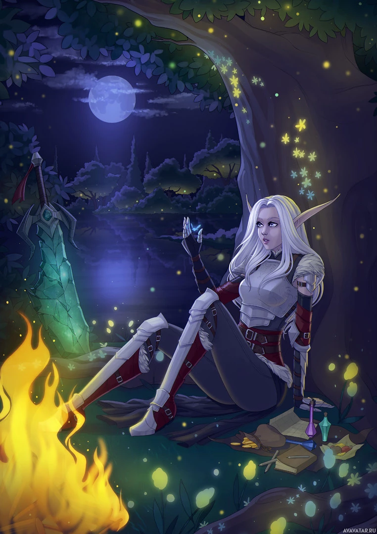 The image depicts a fantasy-themed illustration featuring an elf. The elf is sitting on the ground next to a small fire, surrounded by a magical forest setting at night with