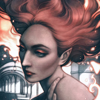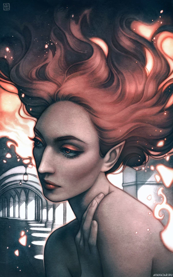 the magical atmosphere of the piece. There are also flames or embers that seem to be coming from her hand or hair, which could indicate she has some form of