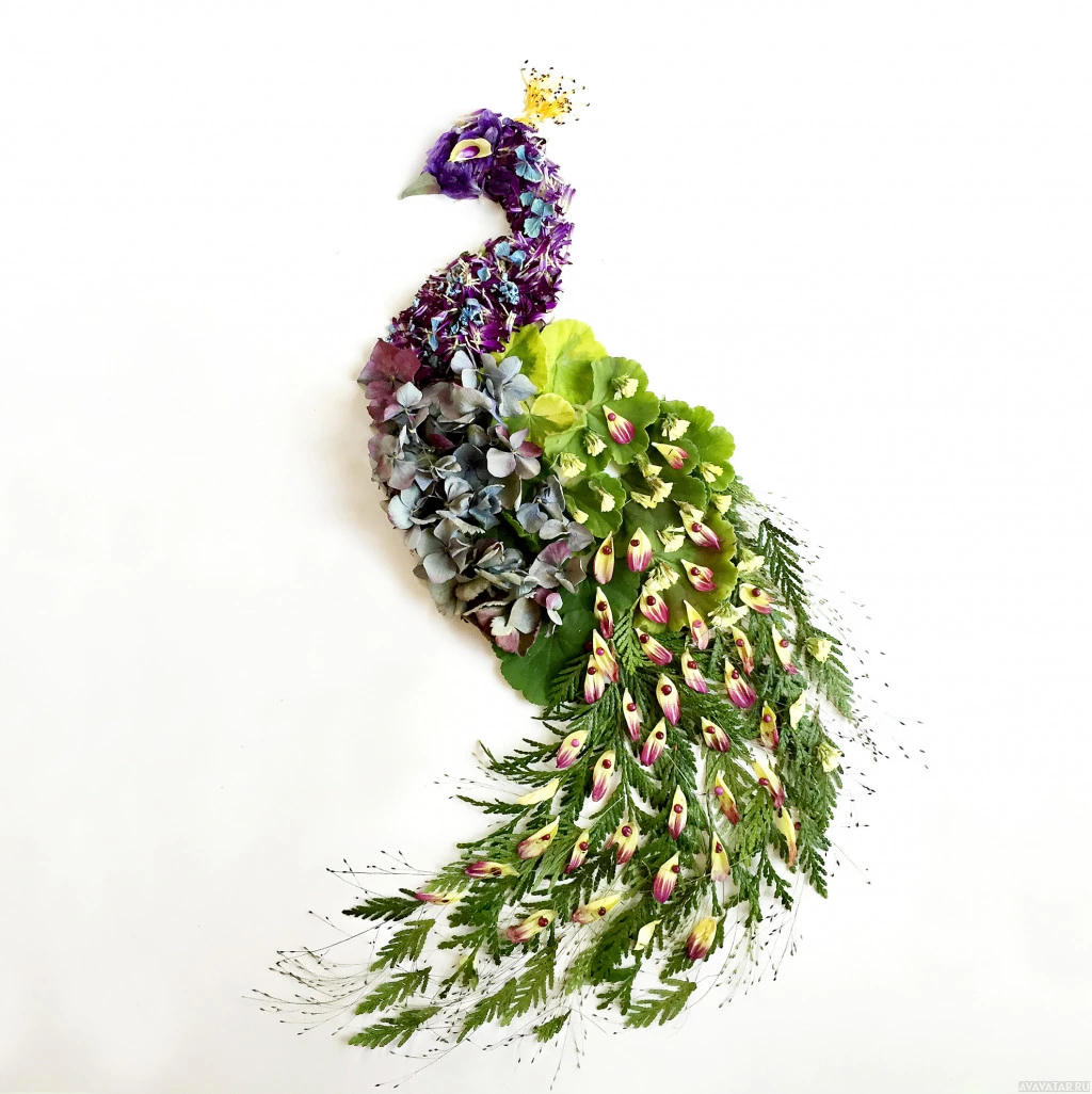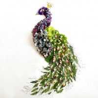 a creative arrangement of flowers and greenery designed to resemble the feathered body of a peacock. The feathers are composed of various textures, colors, and types of plants, including what appears to be pink orchids, purple irises, white daffodils or similar flowers, and